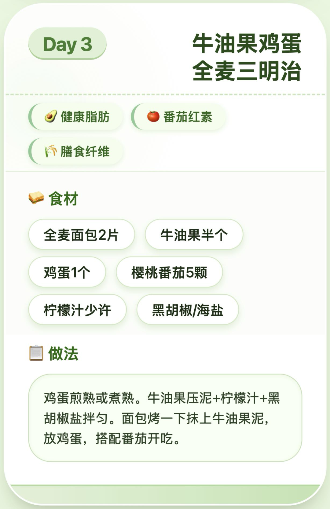 Day3️⃣:牛油果鸡蛋三明治,健康脂肪+膳食纤维,饱腹感到中午。