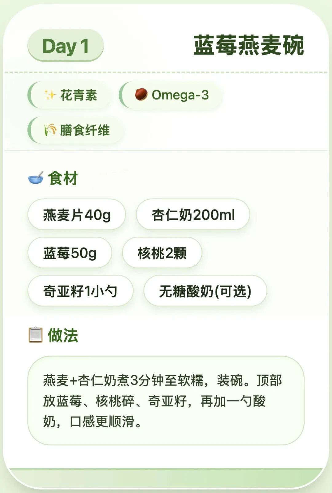 Day1️⃣:蓝莓燕麦碗,花青素和Omega-3打底。