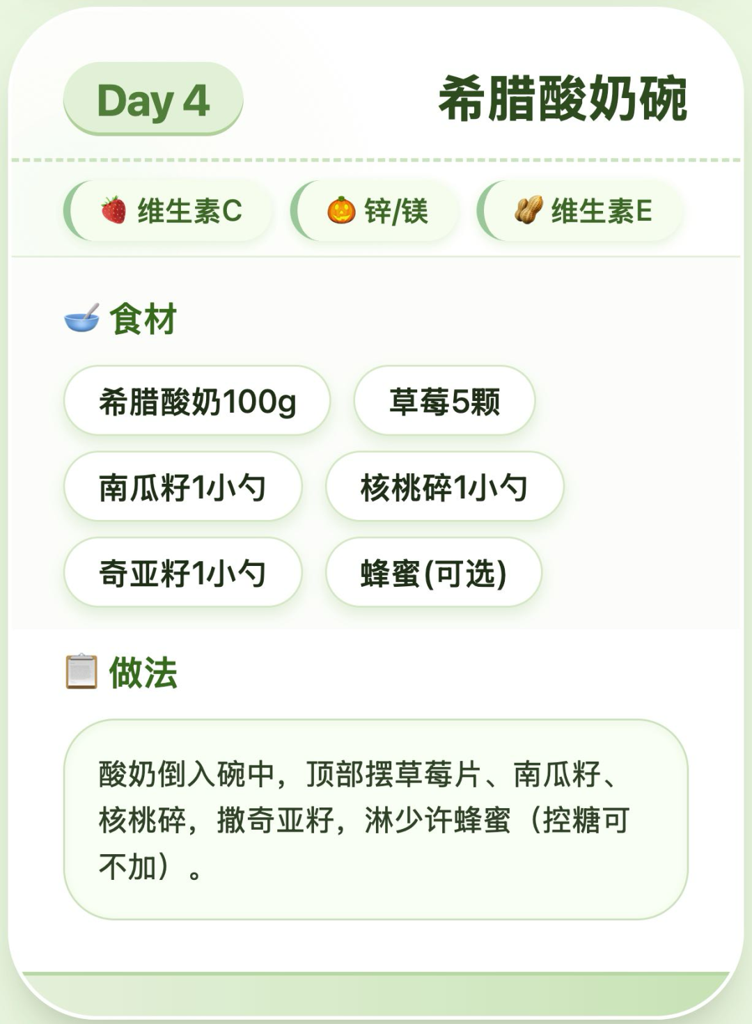 Day4️⃣:希腊酸奶碗,草莓、南瓜籽、奇亚籽,像吃甜品一样抗炎。