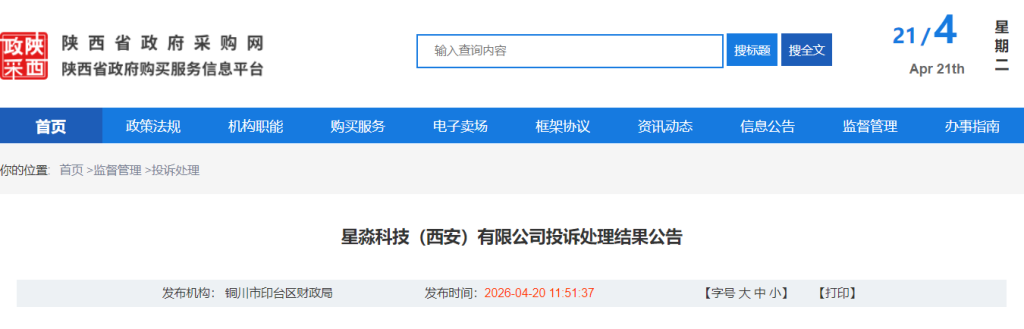 4月20日,陕西省政府采购网发布上述《星淼科技(西安)有限公司投诉处理结果公告》。涉事的招标采购项目是耀州窑陈炉窑址陶瓷烧制技艺国家非遗保护展示设备配套采购项目。