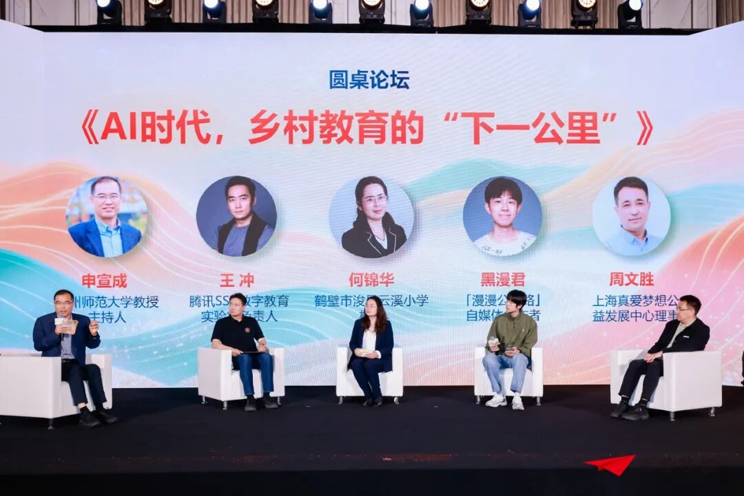 随后的圆桌论坛以“AI时代,乡村教育的‘下一公里’”为题展开了激烈碰撞。由杭州师范大学教授申宣成主持,腾讯SSV数字教育实验室负责人王冲先生、鹤壁市浚县云溪小学校长何锦华、全网粉丝超 1400 万,持续创作“漫漫公益路”短视频系列的自媒体创作者,青年公益人黑漫君、上海真爱梦想公益发展中心理事周文胜先生四位嘉宾展开深度对话。
