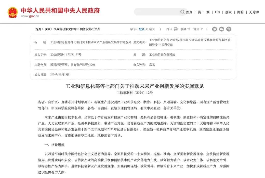 根据《工业和信息化部等七部门关于推动未来产业创新发展的实施意见》,全面布局未来产业,把握全球科技创新和产业发展趋势,重点推进未来制造、未来信息、未来材料、未来能源、未来空间和未来健康六大方向产业发展。