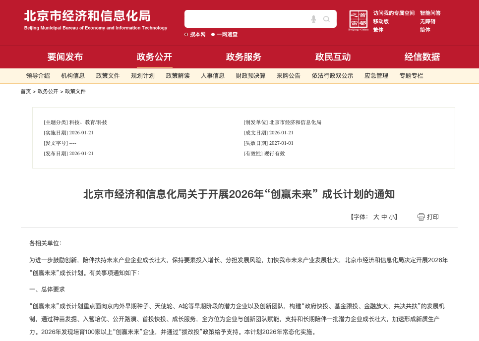 资料参考《北京市经济和信息化局关于开展2026年“创赢未来”成长计划的通知》,想要了解更多,请点击链接:https://jxj.beijing.gov.cn/zwgk/2024zcwj/202601/t20260121_4453847.html
