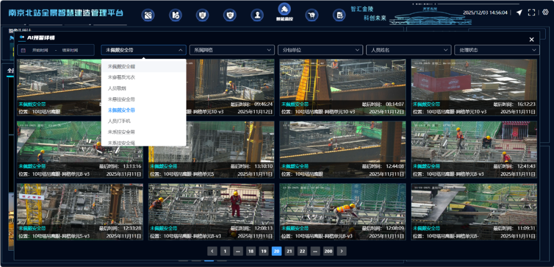 该平台综合运用物联网、BIM、大数据、人工智能等前沿技术,整合人员管理、设备监测、环境管控、视频监控、质量追溯等核心功能,实现安全管理“一网统管、一屏总览”,推动安全管控从“被动应对”向“主动预判”转变。在施工区域、深基坑、邻近营业线、材料堆场、施工出入口等关键部位,项目全面布设高清智能监控设备,实现24小时不间断、无死角可视化监管,从源头防范安全风险。