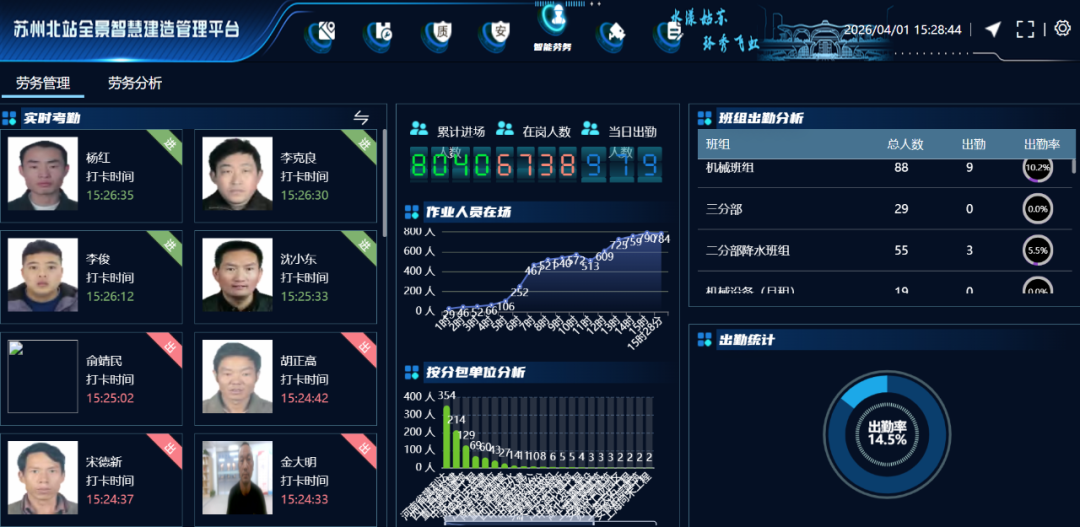 苏州北站项目总建筑面积约80.15万平方米,站房结构为地上4层、地下3层(含局部夹层),站场规模达10台24线,采用“高架站型、上进夹出”设计,以3场并场布置模式,由北至南分别设置既有京沪高铁场、通甬高铁场及城际场。面对施工场景复杂、作业人员密集、危险源点多面广等的实际挑战,项目高标准搭建智慧工地管理平台,为安全管控注入科技动能。