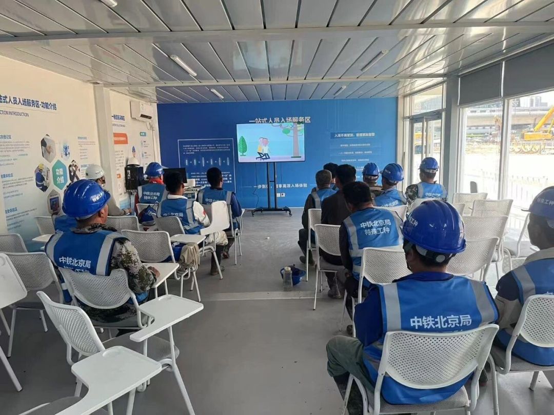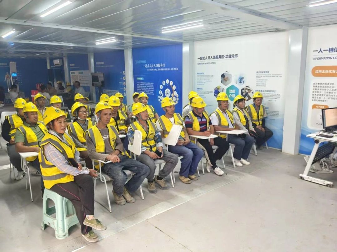 在人员管理上,项目全面推行实名制管理及深基坑专项实名制管控,通过人脸识别智能门禁系统,实现人员进出自动考勤、身份精准核验、行动轨迹可查可溯。创新启用一站式入场教育培训模式,集中办理信息登记、健康体检、安全培训、电子签署与无纸化考试,考核合格后方可生成专属安全帽二维码,未经培训考核合格者一律不得上岗,从源头严把人员准入关。