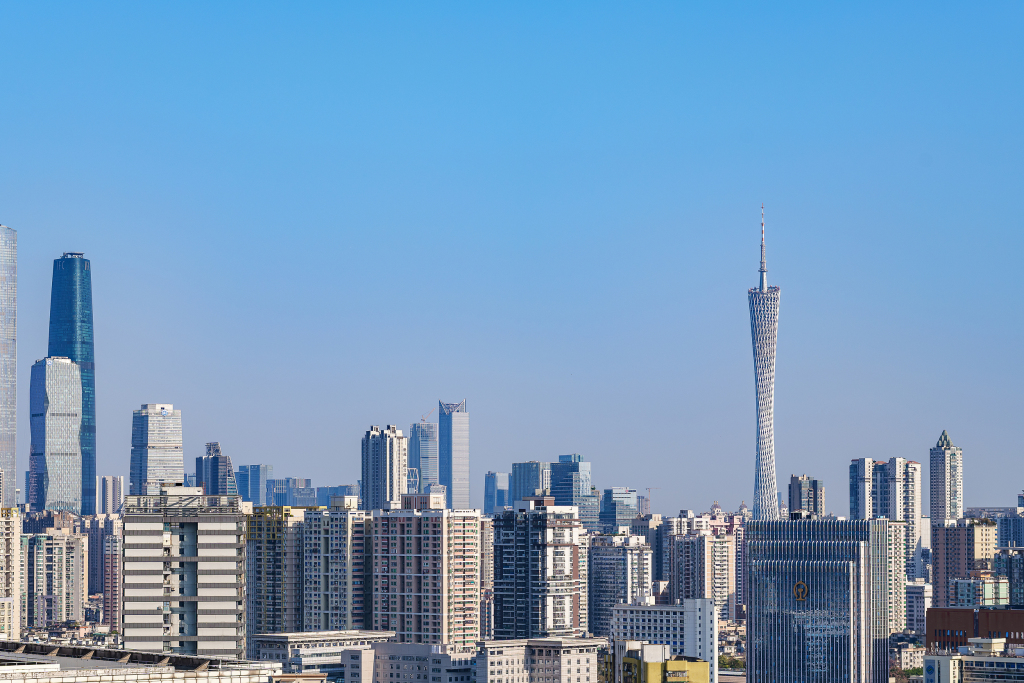 蓝天下的广州城市CBD珠江新城。视觉中国 资料图