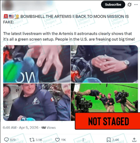 几个宇航员漂浮在绿幕前,面对着摄像机,发布者暗示,阿尔忒弥斯2号的任务是在摄影棚里拍摄的。