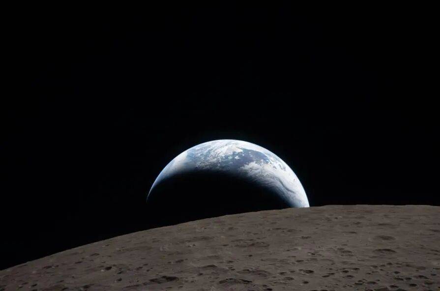 猎户座飞船掠过月球,四名宇航员拍下了一张“地球落日”的照片——蓝色的地球半掩悬在黑暗中,缓缓沉落月平线之下,近在咫尺的月面如同一面苍茫的灰墙。这张照片,与58年前人类首次载人绕月飞行时拍摄的那张“地球升起”,完成了跨越半世纪的一次深情对望。