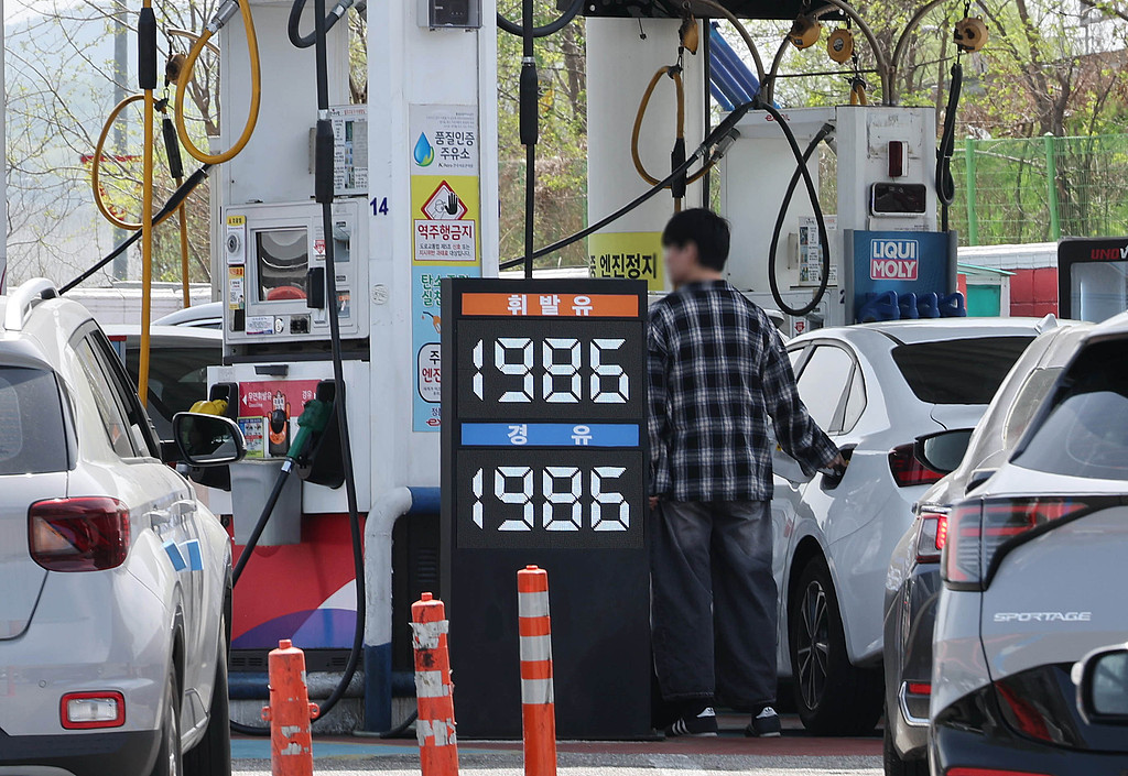 当地时间2026年4月19日,韩国首尔,首尔光化门广场加油站前张贴着不断上涨的汽油价格。视觉中国 图