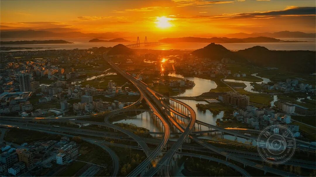 拍摄于浙江乐清。高空俯瞰之下,纵横交错的立交与江河如城市的血脉般舒展,日出朝晖为路网、水面与楼宇镀上一层暖金。光影流转间,自然山河与现代都市脉络交织共生,既勾勒出大地的壮阔肌理,也传递出城市在晨光中苏醒的蓬勃生机,诠释了 “鸟瞰视界” 下的时代气象与造物之美。