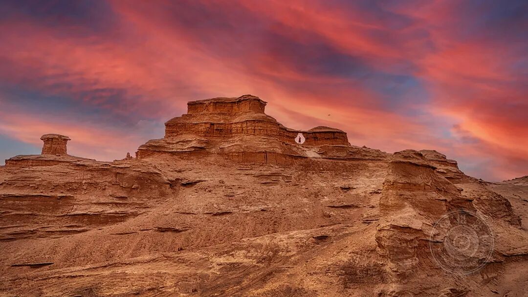 2025年10月11日,拍摄于新疆大海道。状似古堡的雅丹地貌,矗立在漫天红霞中,尽显大漠苍凉。