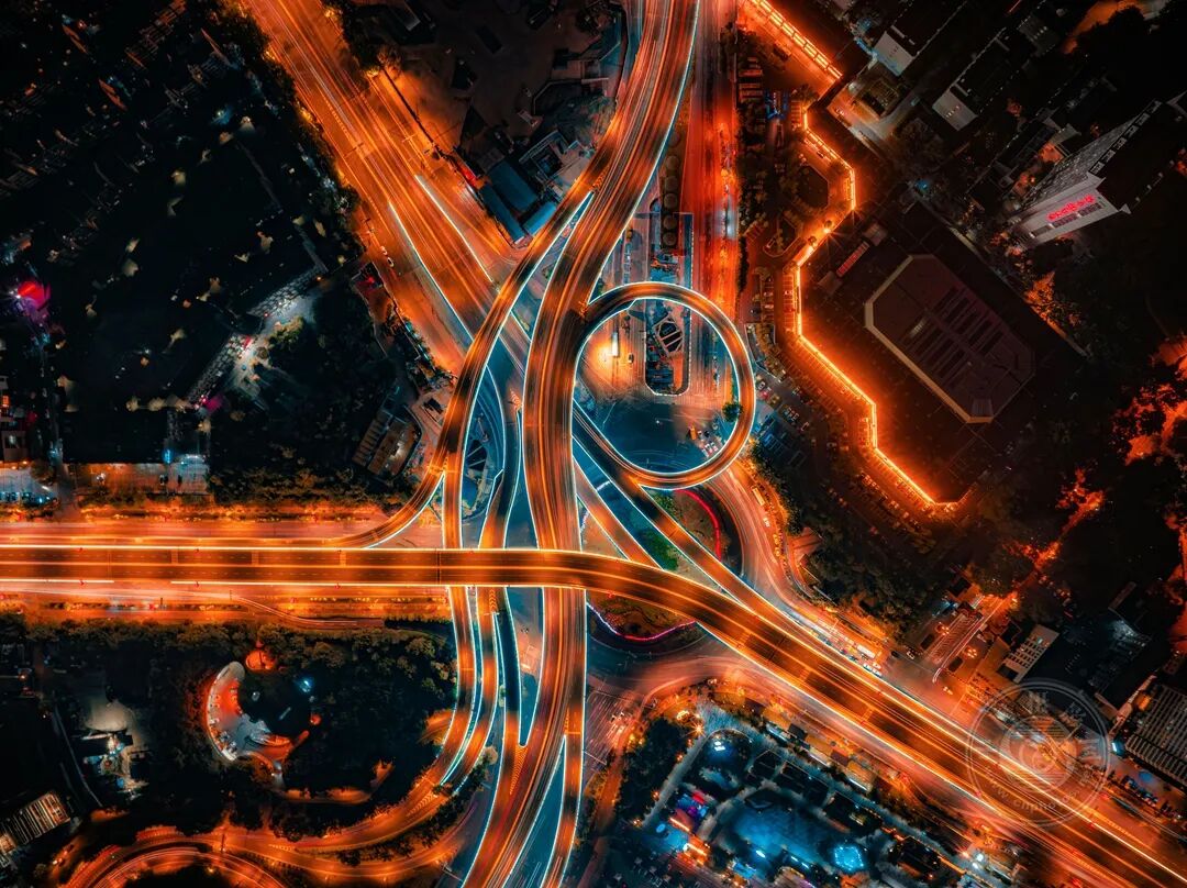 江苏,南京,新庄立交。夜色中的立交桥在长曝光下化作回旋交织的光轨,城市道路被抽象为线、环与速度的痕迹:冷暖色调的强烈对比,展现着现代都市脉搏般的律动感。