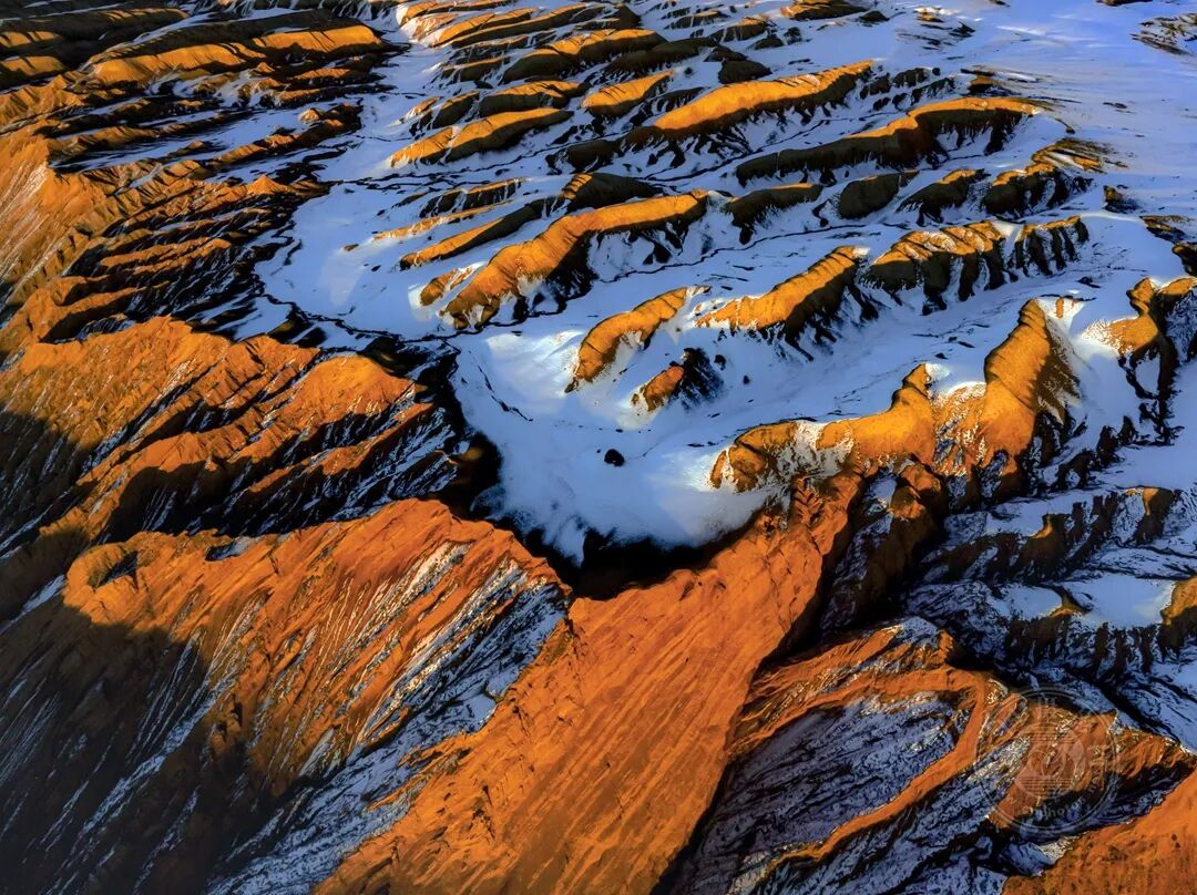 鸟瞰新疆独山子大峡谷顶,在夕阳的辉映中沟壑与残雪交织,冷暖碰撞彰显雄浑肌理,勾勒出天山北麓地貌之美。