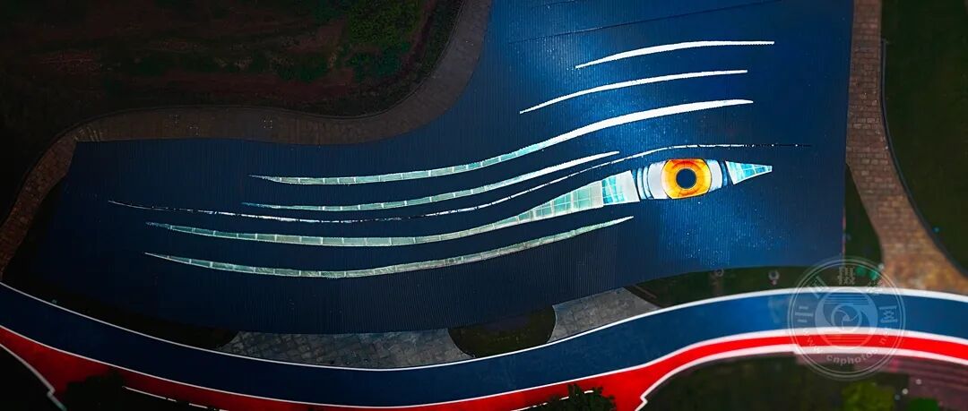 2025年9月12日拍摄于四川省德阳市中江县凯州新城,鸟瞰建筑物形如一只看向天空的眼睛。这张航拍作品以高空俯拍视角,将建筑屋顶的 “天眼” 设计转化为极具张力的视觉符号。构图上,以橙黄瞳孔为视觉中心,用流畅曲线构建流动韵律,在对称与动态间达成平衡;色彩上,深蓝屋顶与暖橙瞳孔、红蓝步道形成强烈对比,既凸显现代建筑的材质质感,又强化视觉冲击力;柔和散射光细腻呈现细节,让“城市之眼”的隐喻更具感染力,完美诠释了科技与人文的诗意碰撞。