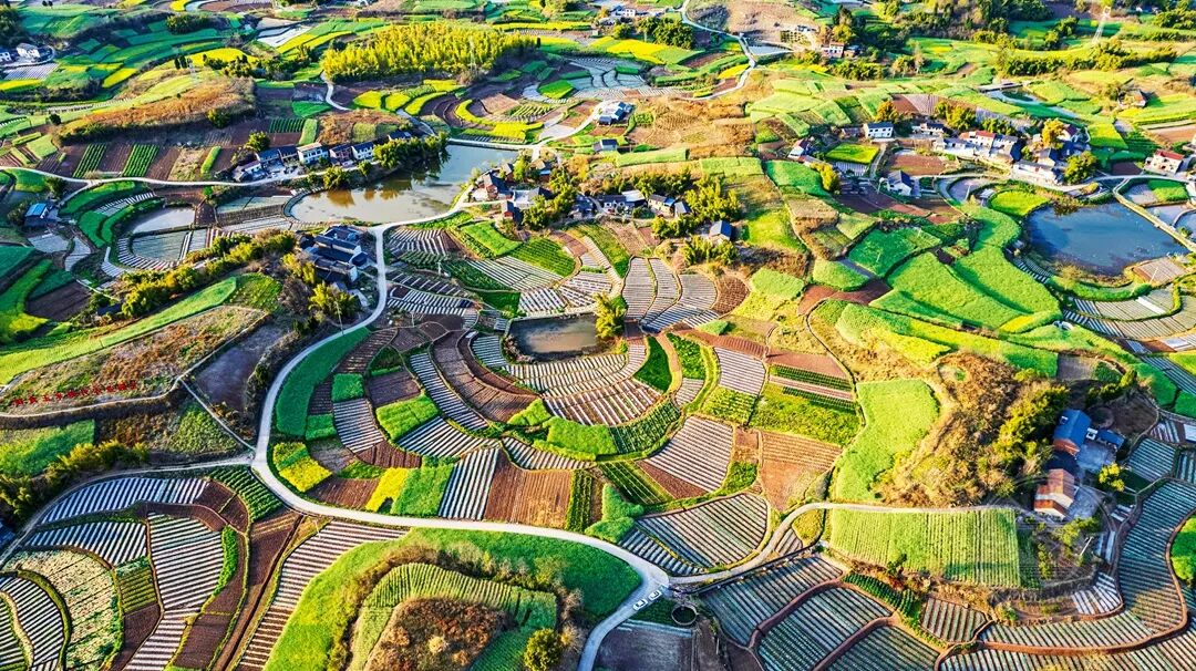 2024年3月19日,拍于威远县界牌镇。五彩斑斓的田垄如大地调色盘般铺展,水塘、村落点缀其间,尽显田园春色之美。