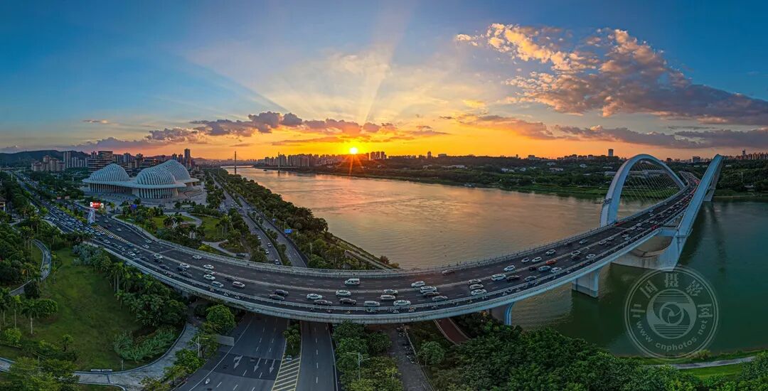 2025年9月23日摄于广西南宁市南宁大桥。当天傍晚,南宁市的上空,出现了火红的晚霞,穿破云层,光芒万丈,放射出美丽的光芒, 给南宁市增添了美丽的色彩,非常壮观,美不胜收。图为在晚霞照耀下的南宁大桥风貌。