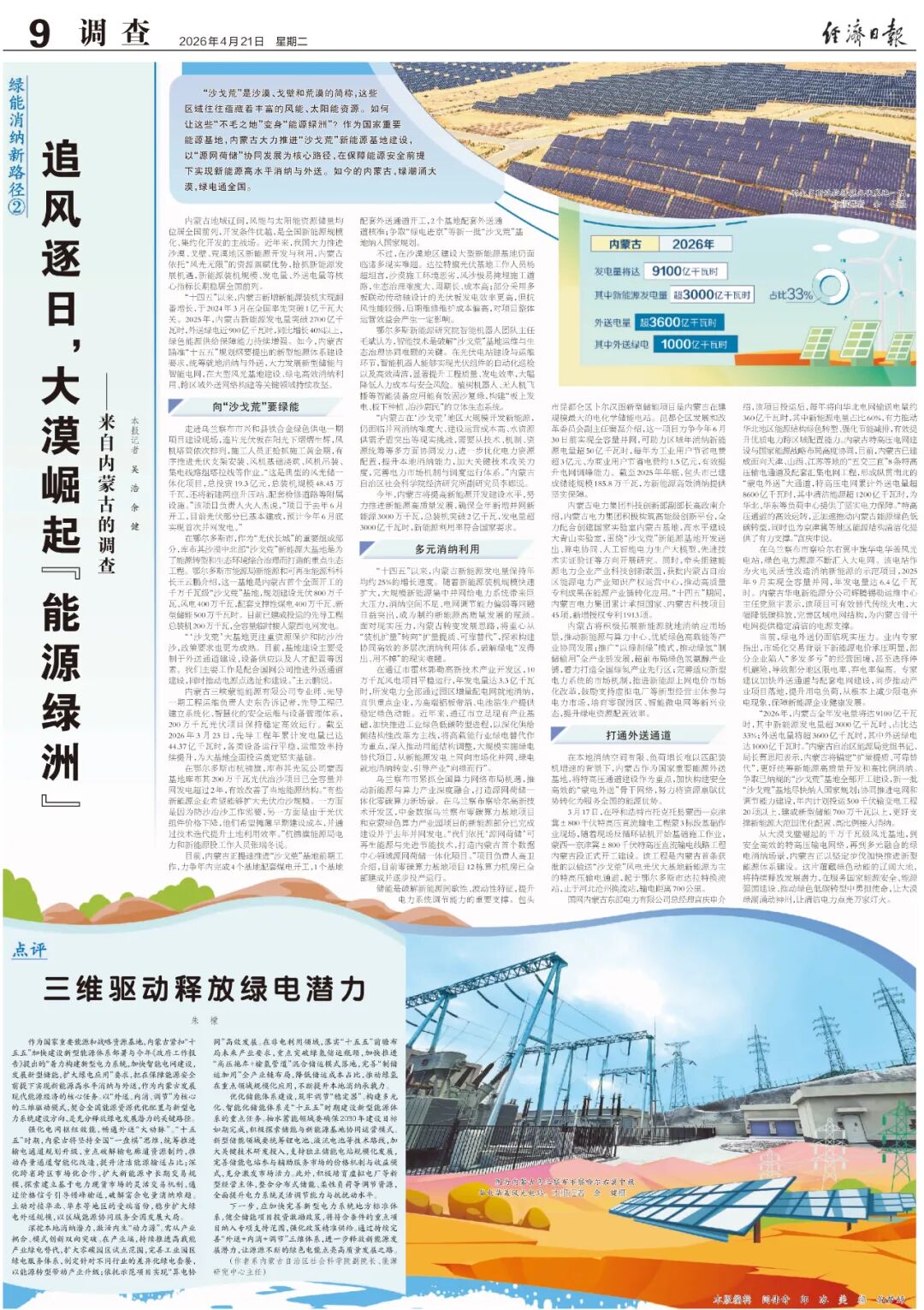 2026年4月21日,《经济日报》第9版刊发题为《追风逐日,大漠崛起“能源绿洲”——来自内蒙古的调查》的文章,报道了作为国家重要能源基地,内蒙古大力推进“沙戈荒”新能源基地建设,以“源网荷储”协同发展为核心路径,在保障能源安全前提下实现新能源高水平消纳与外送。如今的内蒙古,绿潮涌大漠,绿电通全国。