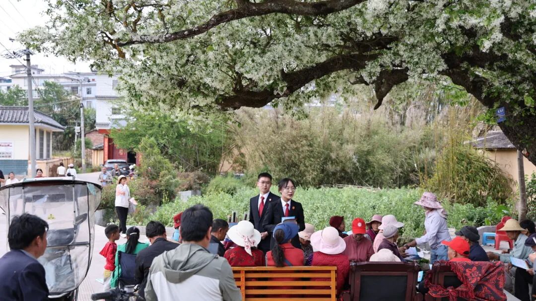 保护令发布当天,南华县人民法院组织青年干警走进马军营流苏古树所在地,在斑驳的树荫下开展了一场生动的生态环境法治宣传。“流苏树伴随着我们成长,从小父辈们就告诉我们要保护这株古树,我们这里的大人娃娃都像敬畏自己的长辈一样敬畏它。”许正发老人的这番话,道出了古树在村民心中的分量。干警结合当地百姓对古树的深厚感情,手持《中华人民共和国生态环境法典》,用通俗易懂的语言向围坐的村民和过往游客讲解古树的生态价值、文化意义和法律保护条款。
