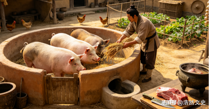 从先秦时期传下来的“六畜”之说,到了汉代依然是最主流的肉食食材。不过这“六畜”在汉代人的食谱中,地位也不一样。猪肉是汉代最主要的肉类食材。中国人对猪的驯化可以追溯到新石器时代,而到了汉代,猪的饲养已经十分普遍。《淮南子》中曾说:“彘者,家人所常畜而易得之物也” ,可见猪肉确实是民间比较常见的肉食。当时对猪的饲养主要有两种方式,一种是与今天相似的圈养。汉代的墓葬中经常有陶猪、陶猪圈的明器出土。另一种今天比较少见,就是在比较开阔的地方放牧养猪。汉代很多名臣早年困窘的时候,都有过“牧豕”的经历,比如西汉名相公孙弘,早年就曾经“家贫,牧豕海上” 。