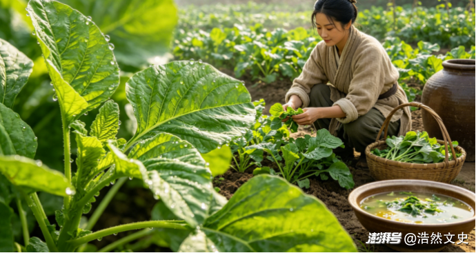 薤和芜菁。薤,也就是藠头,味辛、甘,是汉代农家常种的蔬菜,可食用也可入药。汉代曾有循吏要求治下百姓每户种植薤百本 ,被史家当做善政记在史书上。芜菁也叫蔓菁,即大头菜,叶子和根茎都可以食用,在汉代种植业很普遍,《四民月令》记载北方庄园农时,当时人们在六七月种植芜菁,十月收获。灾荒年间芜菁因为根茎硕大,可饱腹,也被人们当做主食。