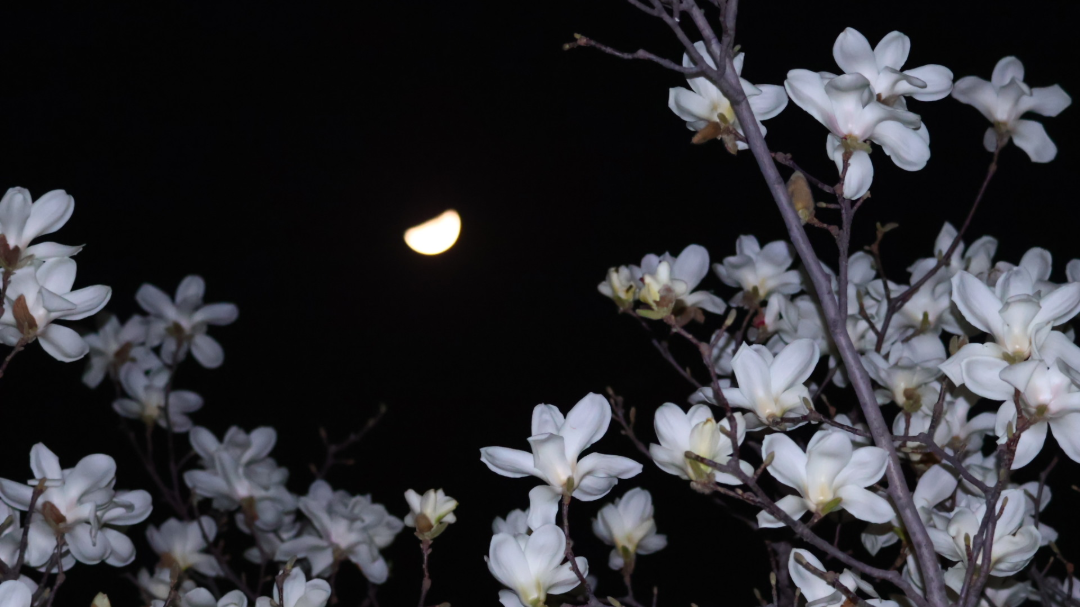 校园里的玉兰花开了,来得悄无声息。某天晚上走出图书馆,抬头看,玉兰初绽,明月渐盈,春夜澄澈。白日的嘈杂喧嚣散去,玉兰的香气变得浓郁,原来青春不只有案头的公式与论文,还有这样不期而遇的温柔。