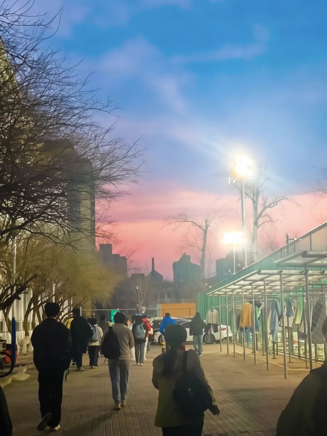 暮色漫过校园,粉蓝晚霞铺满下课路上,春风裹着暖意掠过枝桠,路灯渐次亮起,人流踏着晚风前行。把一天的疲惫,都融进这春日的黄昏里。