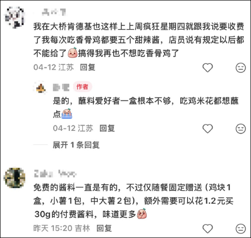 肯德基蘸酱要收费了?有门店张贴通知:4月20日起糖醋酱、甜辣酱改为收费产品
