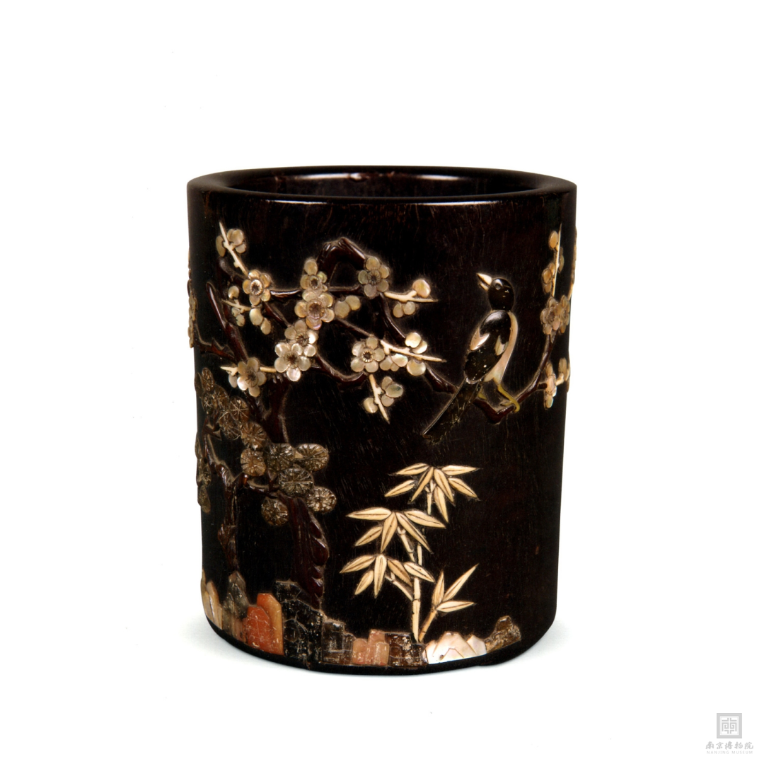 清中期 紫檀嵌百宝花鸟图笔筒