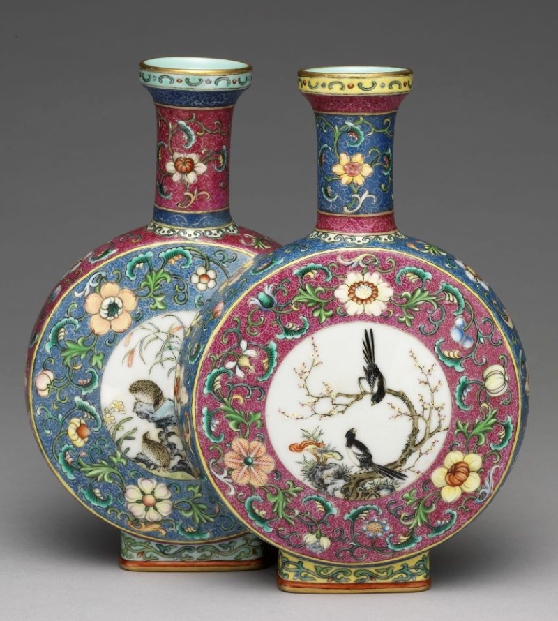 清乾隆 洋彩开光花鸟纹双连瓶