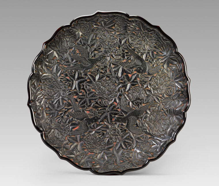 近代 剔黑喜鹊芙蓉纹莲瓣形盘