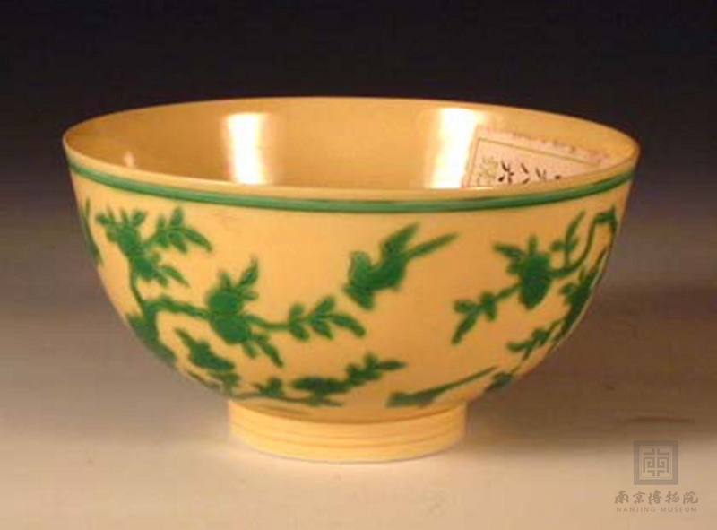 清乾隆 黄地绿彩喜鹊桃石纹瓷碗