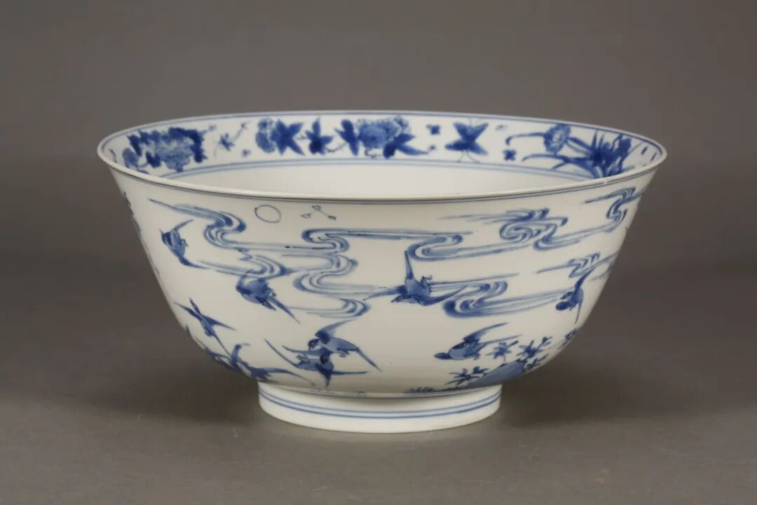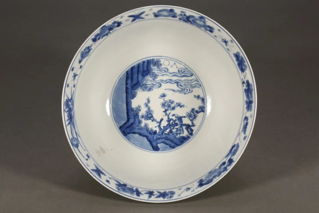 观复博物馆藏【清康熙 青花日日见喜纹碗】碗壁外周聚集飞翔着三十只喜鹊,有的驻脚在枝桠,有的飞行于穿峰云间,星光日光同现,有声名鹊起的美意。碗内又沿绘四季花卉,蝴蝶翩翩。碗心则为“喜上眉梢”传统图案。