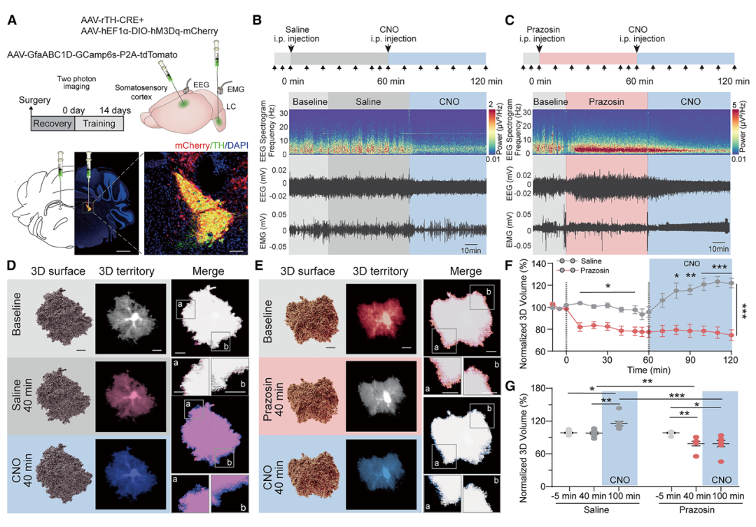 药理实验发现,阻断α1 肾上腺素能受体,星形胶质细胞直接缩小,阻断 α2、β 受体则无效果。用化学遗传学激活蓝斑 TH 阳性神经元,细胞体积显著增加,提前用 α1 受体拮抗剂哌唑嗪可完全阻断该效应;光遗传学激活相同神经元,也能让细胞快速膨胀,拮抗剂同样可消除变化。