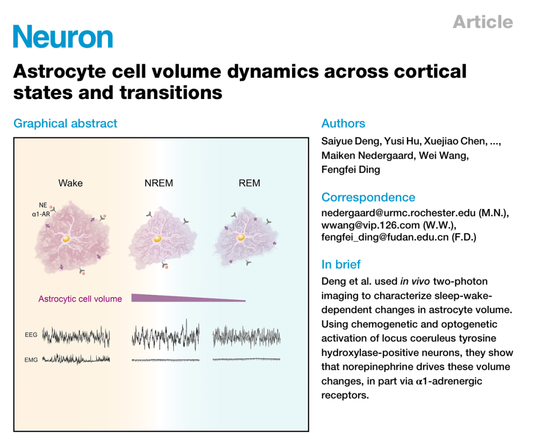 2026年4月20日,复旦大学基础医学院丁凤菲团队,联合华中科技大学同济医学院附属同济医院王伟团队以及丹麦哥本哈根大学Maiken Nedergaard团队在《Neuron》上发表研究《Astrocyte cell volume dynamics across cortical states and transitions 》,首次在活体动物中实时观测到小鼠皮层星形胶质细胞的体积会随睡眠-觉醒周期动态变化——清醒时最大,NREM睡眠时缩小,REM睡眠时最小。