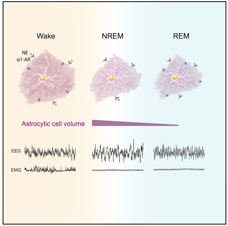 本研究首次在活体证实,小鼠皮层星形胶质细胞体积随睡眠 - 觉醒周期动态变化,由蓝斑释放的去甲肾上腺素通过 α1 肾上腺素能受体驱动,细胞体积与间质腔体积反向变化,进而调控神经胶质相互作用与类淋巴流,揭示了睡眠 - 觉醒调控的全新胶质细胞机制。