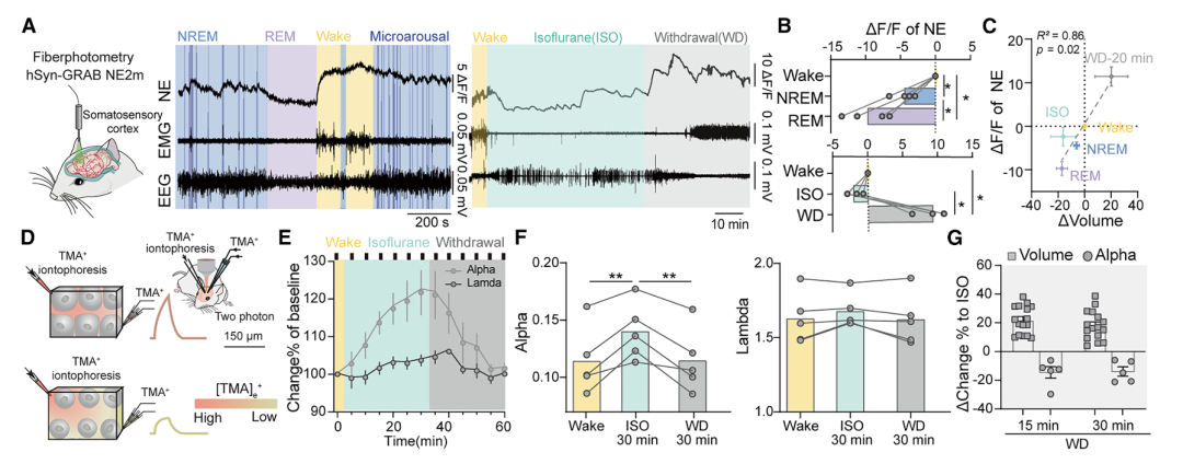 团队用光纤光度法结合 GRAB NE 传感器,检测到大脑间质中去甲肾上腺素(NE)水平和细胞体积完全同步:清醒高、NREM 睡眠低、REM 睡眠最低。同时用TMA + 离子电渗法测得,间质腔体积和细胞体积反向变化 —— 细胞胀大时间质空间变小,细胞缩小时间质空间变大。