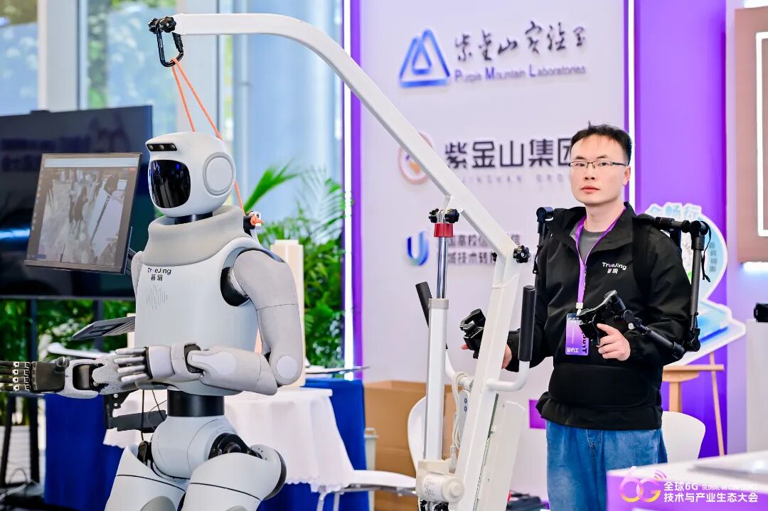 由江苏箸境智能科技有限公司联合紫金山实验室孵化企业南京鑫合通感科技有限公司部署的人形机器人S1也亮相现场。这是全球首个以6G信号传输操作的机器人。该机器人身高170厘米,全身最高可达55个自由度,可根据远程操作员的动作,完成相应任务。江苏箸境智能科技有限公司联合创始人史梦娇表示,未来将加强与紫金山实验室及相关孵化企业对接,将6G等先进通信技术作为连接操作员和人形机器人的桥梁,实现更低时延、更高清画质、更精准数据的采集传输。