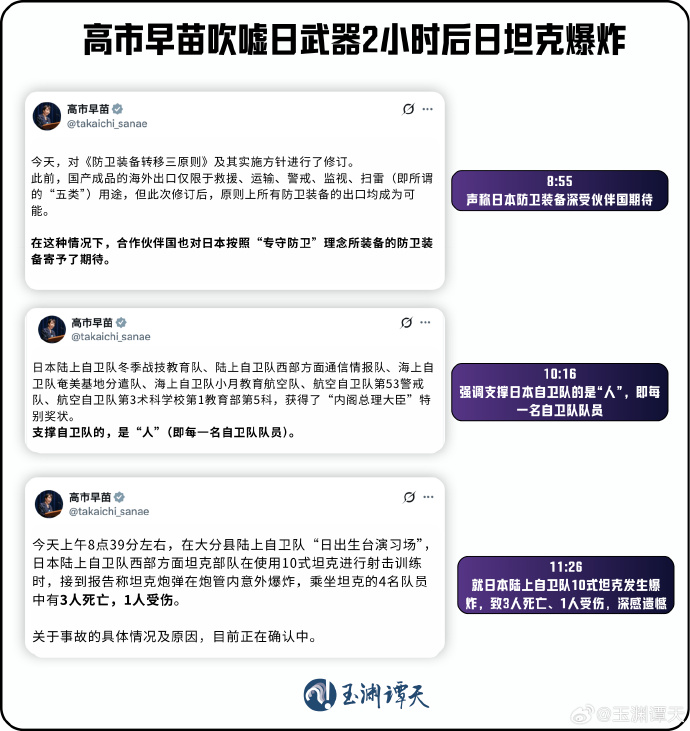 11时26分,高市早苗紧急发布消息,就日本陆上自卫队10式坦克训练时发生弹药爆炸事故深表遗憾。爆炸导致自卫队员3死1伤。高市早苗口口声声说“人很重要”,结果她吹嘘的日本武器,恰恰导致了她所在意的“人”死亡。