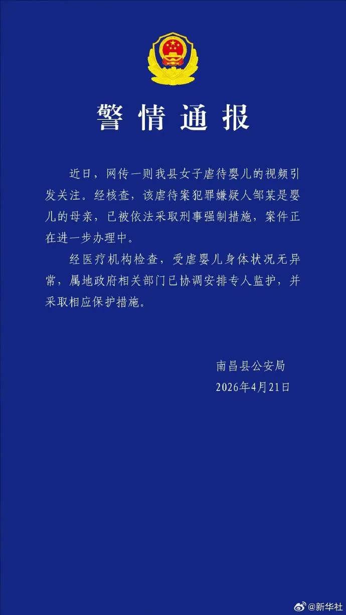 一婴儿脸上被泼牛奶还遭连续扇耳光,南昌警方通报:嫌疑人是婴儿的母亲,已被采取刑事强制措施,受虐婴儿身体状况无异常