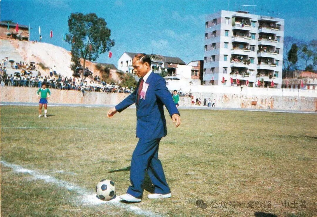 1984年三水西南人民体育场落成剪彩,时任亚洲足球协会会长霍英东为剪彩后举行的足球赛开球(1984年拍摄)。麦国培供图