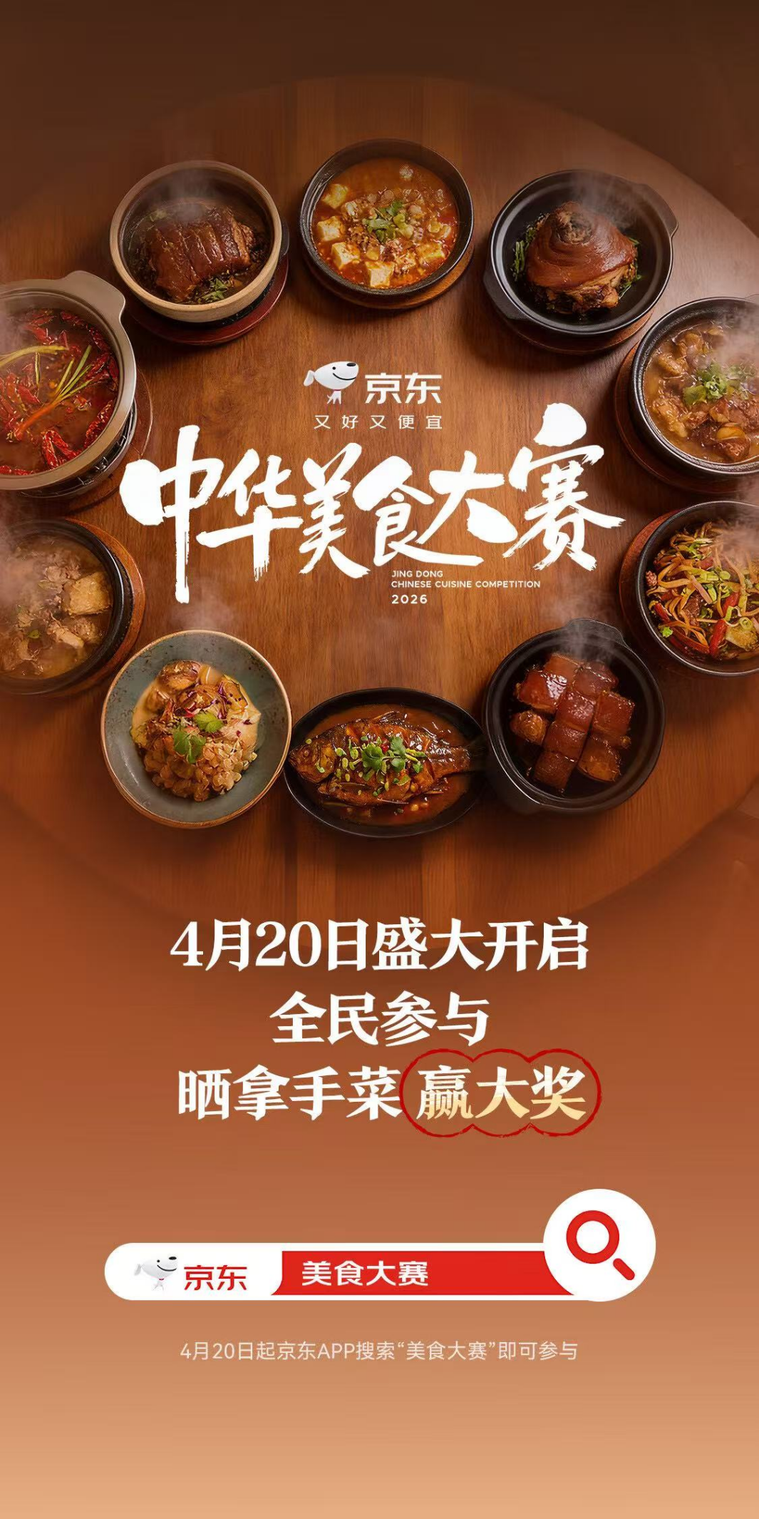 红星新闻记者4月20日获悉,京东携手湖南卫视芒果TV启动了堪称史上规模最大的中华美食大赛。晒出地道拿手菜,一旦胜出,有机会赢得高达百万级的菜品分成,让你的厨艺不仅值钱,还能上电视,更有机会在全国上架!
