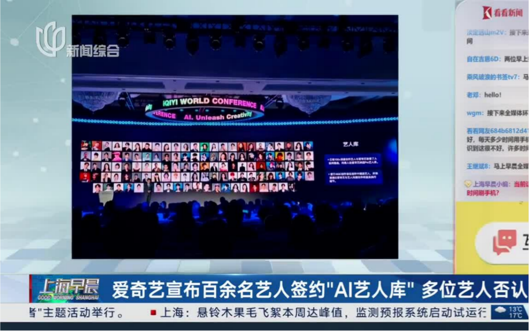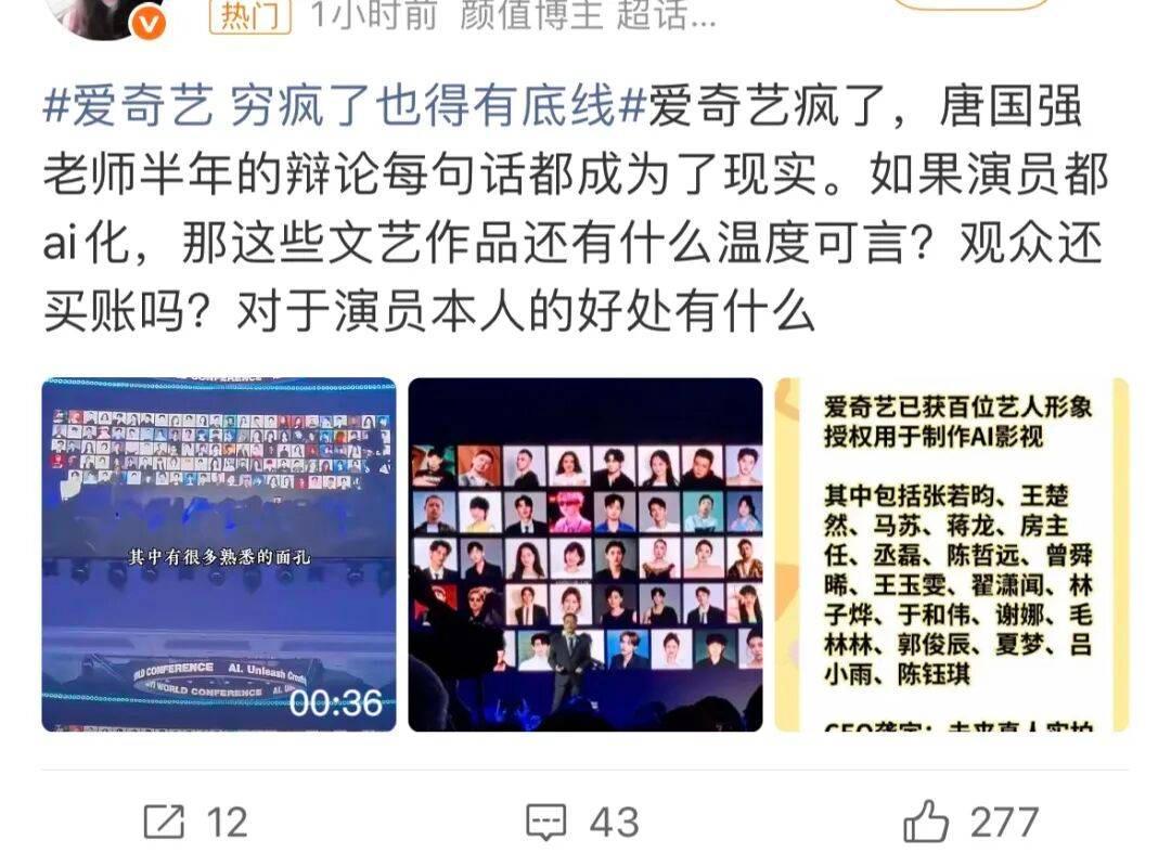 与此同时,爱奇艺宣布超100位艺人入驻AI艺人库,并将“用AI替代真人出演”的发展计划公之于众。