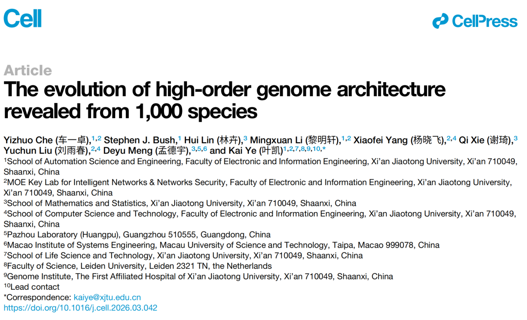 2026 年 4 月 21 日,西安交通大学叶凯团队(车一卓为论文第一作者)在国际顶尖学术期刊Cell 上发表了题为:The evolution of high-order genome architecture revealed from 1,000 species的研究论文。