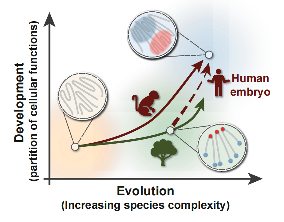 这一演化规律甚至在个体发育中得以“重演”。在人类早期胚胎中,基因组最初也表现出较强的全局折叠特征;随着细胞谱系逐步特化,棋盘格模式才逐渐建立并增强。这暗示了棋盘格结构是细胞分化、实现功能特异化的一种保守机制。