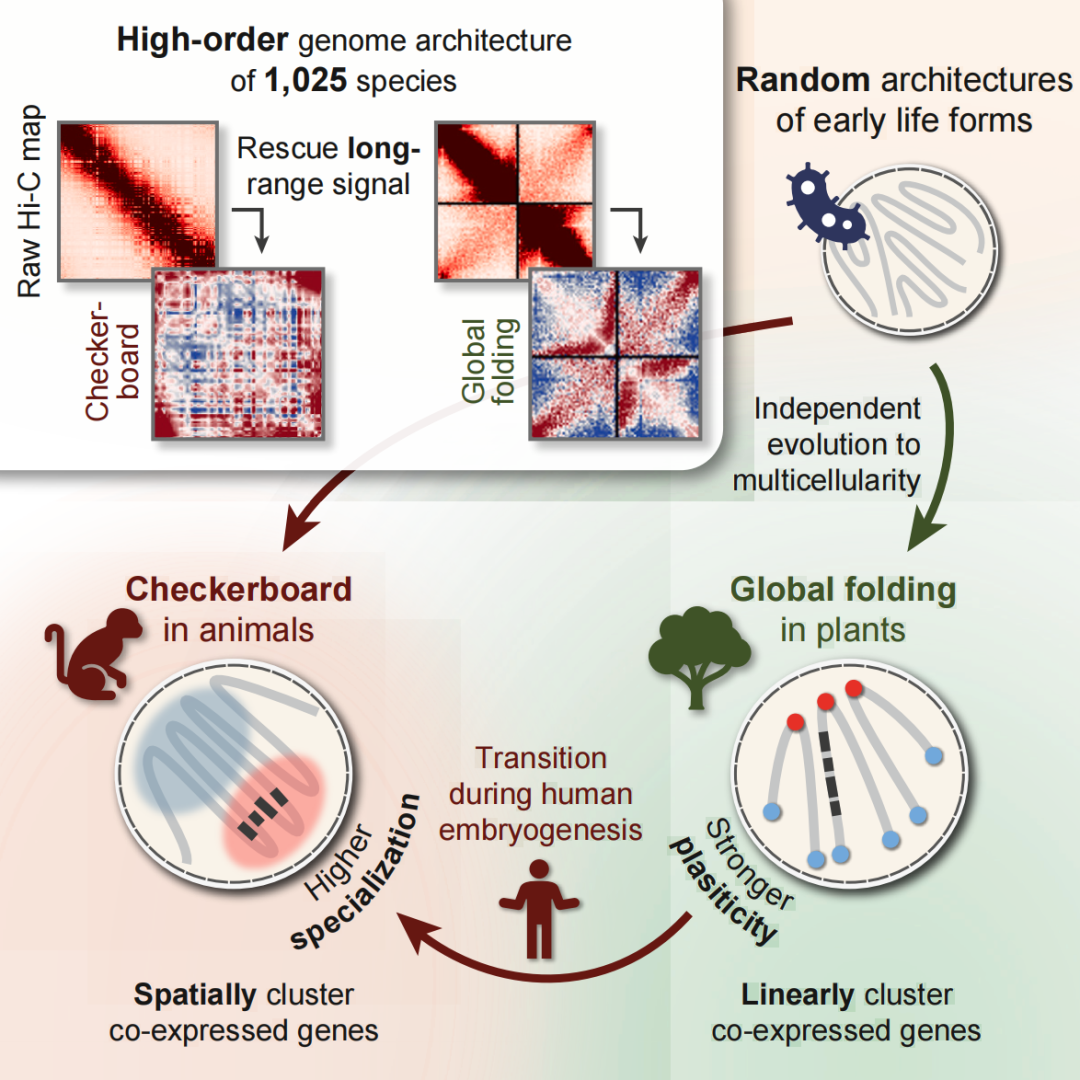 这项研究通过对跨越 38 亿年演化史的 1025 个物种进行大规模的 Hi-C 数据分析,首次系统描绘了高阶基因组架构的演化全景图,追踪了基因组组织的演化轨迹——早期的单细胞生命形式大多呈现出随机的基因组结构。在整个植物演化过程中,全局折叠(染色体组型的空间组织)结构成为并一直保持着主要的形态结构。而动物逐渐发展出了更为明显的棋盘格(染色质区室的空间组织)结构;这些结构在早期胚胎发育过程中也很明显,这表明它们是一种保守的基因调控机制。相比之下,植物表现出相对较弱的棋盘格模式,而是倾向于将共调控基因组织成线性基因组簇。