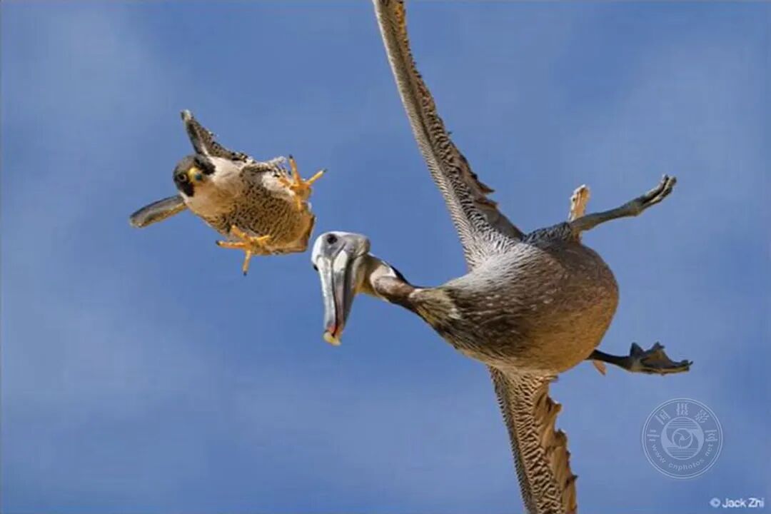 荒野悬崖边,游隼为护巢穴俯冲驱赶体型更大的鹈鹕。地球最快生物以精准攻击展现护雏本能,被袭的鹈鹕多数惊飞,偶有因极速冲击丧生。