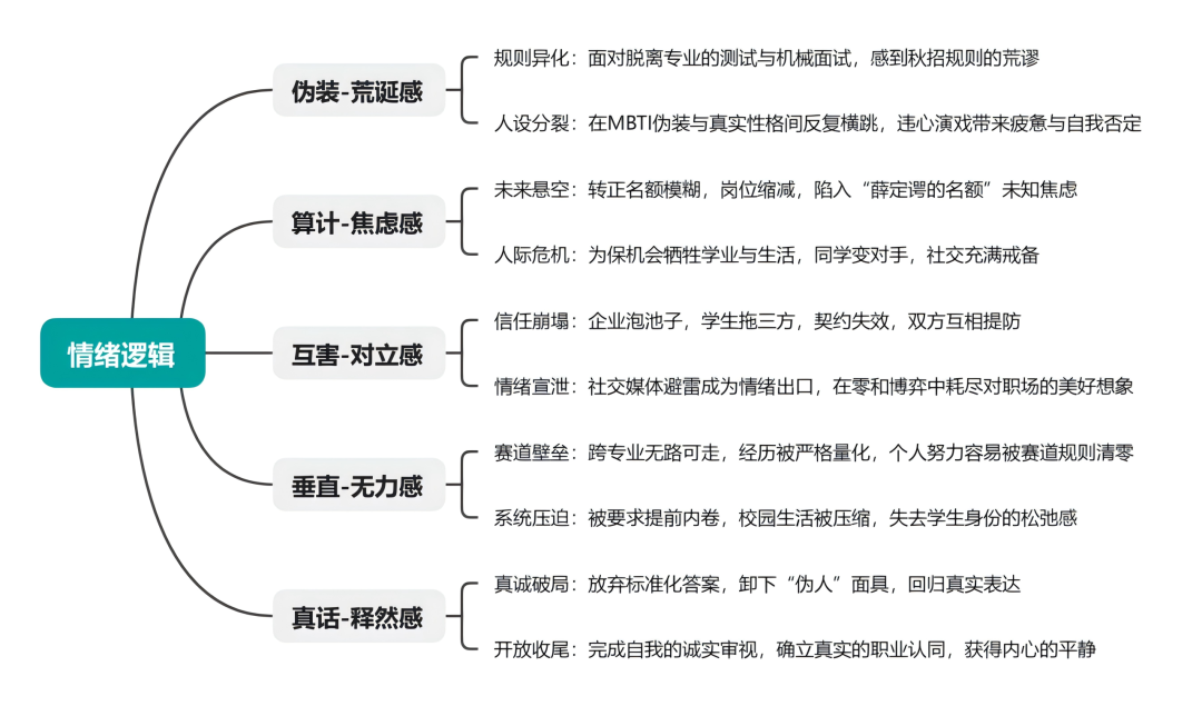围绕“伪人”这一核心,文章最终形成了“伪装—算计—互害—垂直—真话”的结构。这是两条线索交织在一起的结果:一条是个人秋招流程的事实逻辑,一条是读者理解和共情的情绪逻辑。