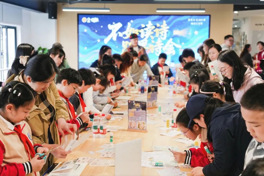 另一位热爱写作的同学则对“拼贴诗”兴致很高:“把平时积累的诗词汇聚在一起重组,特别有意思,给我带来了很多创作灵感。”现场甚至还有学龄前的孩子,在父母的陪伴下流畅地背诵李白的《将进酒》,引来阵阵掌声。