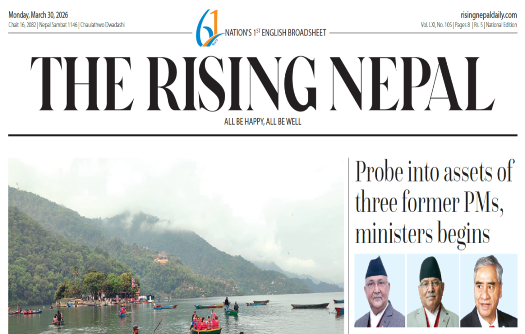 针对三位前总理资产的调查启动(左起依次为奥利、普拉昌达、德乌帕) 来源:《新兴尼泊尔报》2026年3月30日第一版